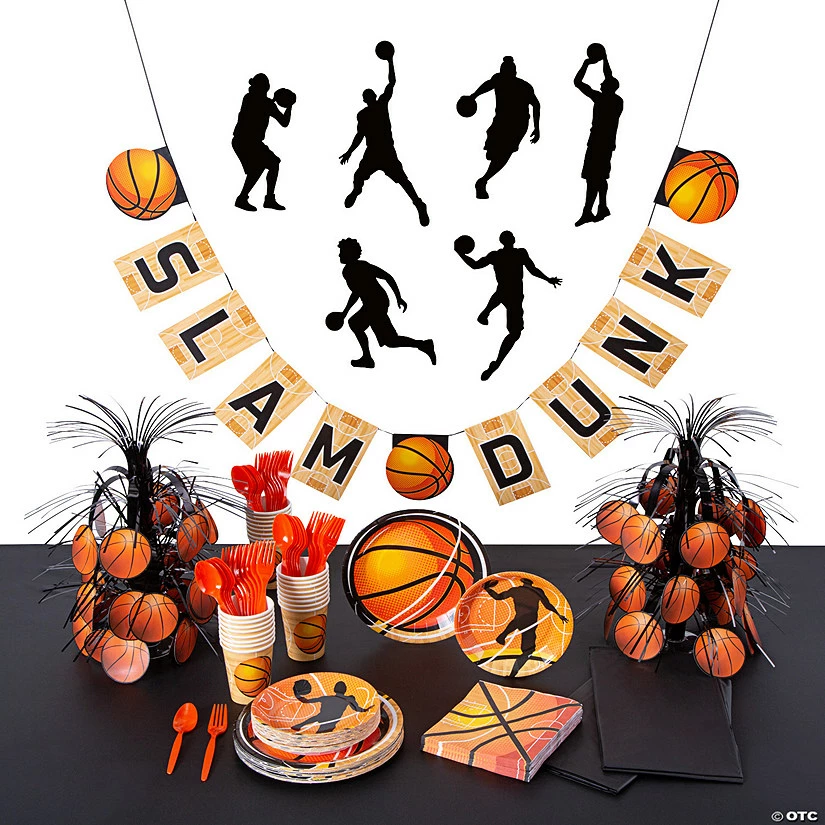 Get the whole team together for a post-season party or for a basketball themed birthday party with the help of this fun tableware kit. This kit has enough disposable plates, napkins, cups and more for a party of up to 24 guests, making the planning before and cleanup afterward as easy as sinking a layup with no defensive players on the court. (164 pcs. per unit)Includes:β’ 6 Cardstock Jumbo Basketball Cutouts (6″ β 13 1/2″ x 15 1/2″ – 22″)β’ 24 Paper Basketball Player Dessert Plates (7 1/4″)β’ 24 Paper Basketball Dinner Plates (9 1/4″)β’ 32 Paper Basketball Luncheon Napkins (6 1/2″)β’ 24 Paper Basketball Cups (3 3/4″ 9 oz.)β’ 1 Paper Basketball Party Garland (7 ft. x 7″)β’ 2 Foil Basketball Tabletop Fountains (Includes a 4″ plastic base and 3″ paper cutouts. 18″)β’ 3 Plastic Black Plastic Tablecloths (54″ x 108″ Disposable.)β’Β 48-Pc. Plastic Orange Fork & Spoon Cutlery Set (includes 24 of each forks and spoons.)β’ Assortments are subject to change at any time and may vary from picture shown. Substituted items will be similar in nature.