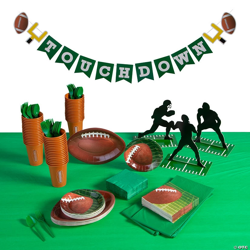 Score big with this party tableware kit thatโs got it all. This comprehensive, football-themed party kit is all you need to host a great birthday party, game day viewing party or other special occasion. You donโt want to fumble on function or looks, so let your guests come together in style with this party tableware set. (235 pcs. per unit)Includes:โข 24 Paper Football Dessert Plates (7″)โข 50 Plastic Disposable Football Cups (4 3/4″ 16 oz.)โข 32 Paper Football Luncheon Napkins (6 1/2″)โข 24 Paper Football-Shaped Dinner Plates (11″)โข 50 Paper Green Beverage Napkins (5″)โข 48-Pc. Plastic Green Fork & Spoon Cutlery Set (Includes 24 of each: green plastic forks and spoons.)โข 3 Plastic Green Tablecloths (Thin, slightly transparent. Disposable. 54″ x 108″)โข 3 Cardboard Football Silhouette Centerpieces (7 1/4″ x 11″ – 12 1/2″ Simple assembly required.)โข 1 Cardstock Football Touchdown Garland (8 ft.)โข Assortments are subject to change at any time and may vary from picture shown. Substituted items will be similar in nature.