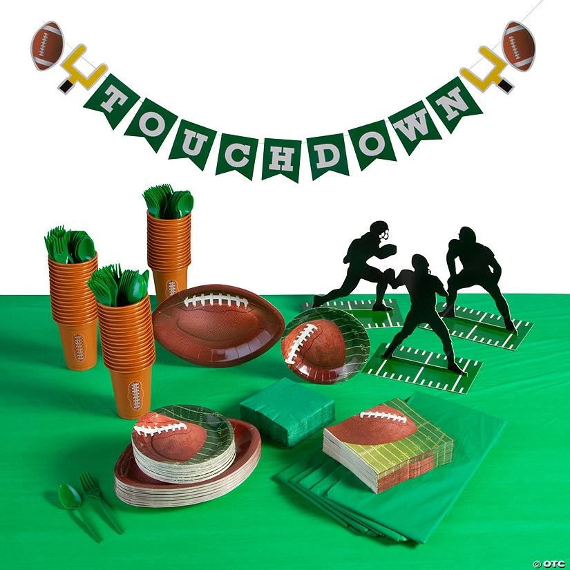 Nothing beats an ultimate football party! This colorful tableware set for 48 guests is ready to score big points with the whole team, while making sure you donโt fumble on design or function. Load these sturdy plates, napkins and cups up with thirst-quenching, hunger-satiating treats for birthday parties, game viewing events and other football-related events! (350 pcs. per unit)Includes:โข 48 Paper Football Dessert Plates (7″)โข 50 Plastic Disposable Football Cups (4 3/4″ 16 oz.)โข 48 Paper Football Luncheon Napkins (6 1/2″)โข 48 Paper Football-Shaped Dinner Plates (11″)โข 50 Paper Green Beverage Napkins (5″)โข 96-Pc. Plastic Green Fork & Spoon Cutlery Set (Includes 48 of each: green plastic forks and spoons.)โข 6 Plastic Green Tablecloths (Thin, slightly transparent. Disposable. 54″ x 108″)โข 3 Cardboard Football Silhouette Centerpieces (7 1/4″ x 11″ – 12 1/2″ Simple assembly required.)โข 1 Cardstock Football Touchdown Garland (8 ft.)โข Assortments are subject to change at any time and may vary from picture shown. Substituted items will be similar in nature.