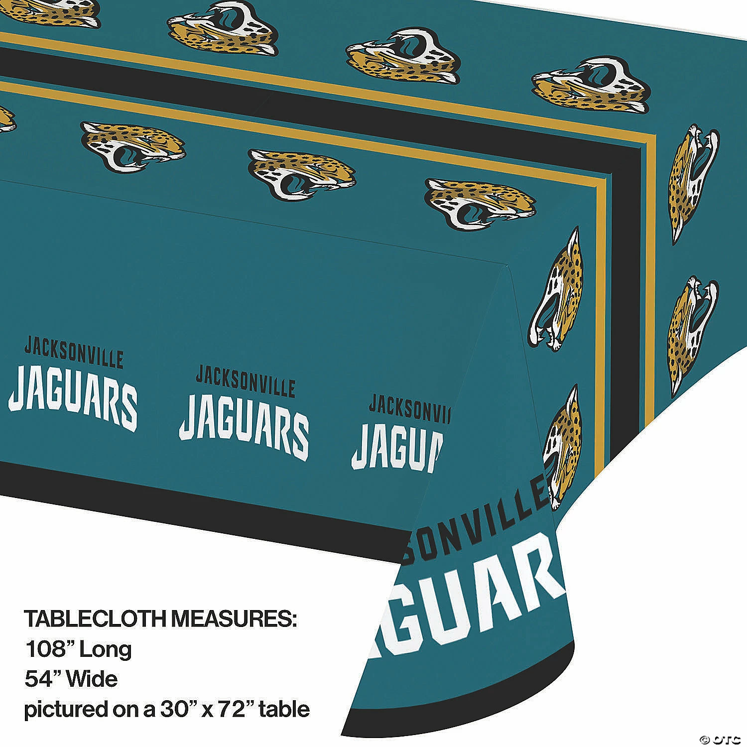 Set the scene for an awesome fan celebration and drape tables with the Jacksonville Jaguars Table Cover. The durable plastic cover measures 54β x 102β and features a teal colored background with a black center stripe bordered in gold, logos, and the team’s name repeated throughout the pattern. Sold in packs of 3, it’s best to keep this cover handy for tailgating events, playoff barbeques, or game day at-home viewing. Special Shipping Information: This item ships separately from other items in your order. This item cannot ship to a P.O. Box. This item may be subject to additional processing days. ITEM IS NOT ELIGIBLE FOR EXPEDITED SHIPPING