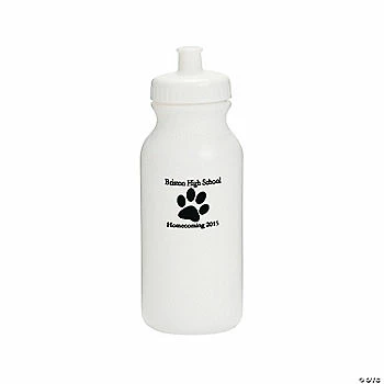 Stock up on these custom paw print water bottles for your next big sporting event! Perfect for practice or the game, athletes will keep hydrated in style. These sport bottles also make great prizes or giveaways at school functions, dances or events. Each custom bottle is pre-printed with paw print logo, perfect for tigers, cougars, lions, bobcats, wildcats and more! Personalize with 2 lines of 20 characters/spaces per line. Plastic. (50 pcs. per unit) 7 3/4″ 20 oz. ยฉ OTC