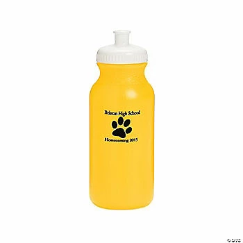 Stock up on these custom paw print water bottles for your next big sporting event! Perfect for practice or the game, athletes will keep hydrated in style. These sport bottles also make great prizes or giveaways at school functions, dances or events. Each custom bottle is pre-printed with paw print logo, perfect for tigers, cougars, lions, bobcats, wildcats and more! Personalize with 2 lines of 20 characters/spaces per line. Plastic. (50 pcs. per unit) 7 3/4″ 20 oz. ยฉ OTC